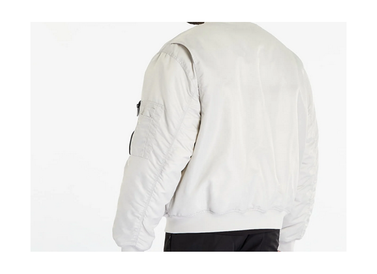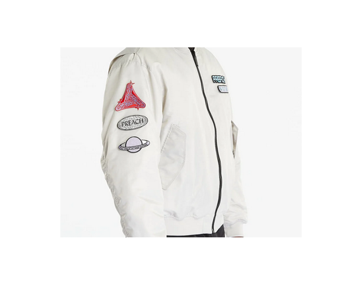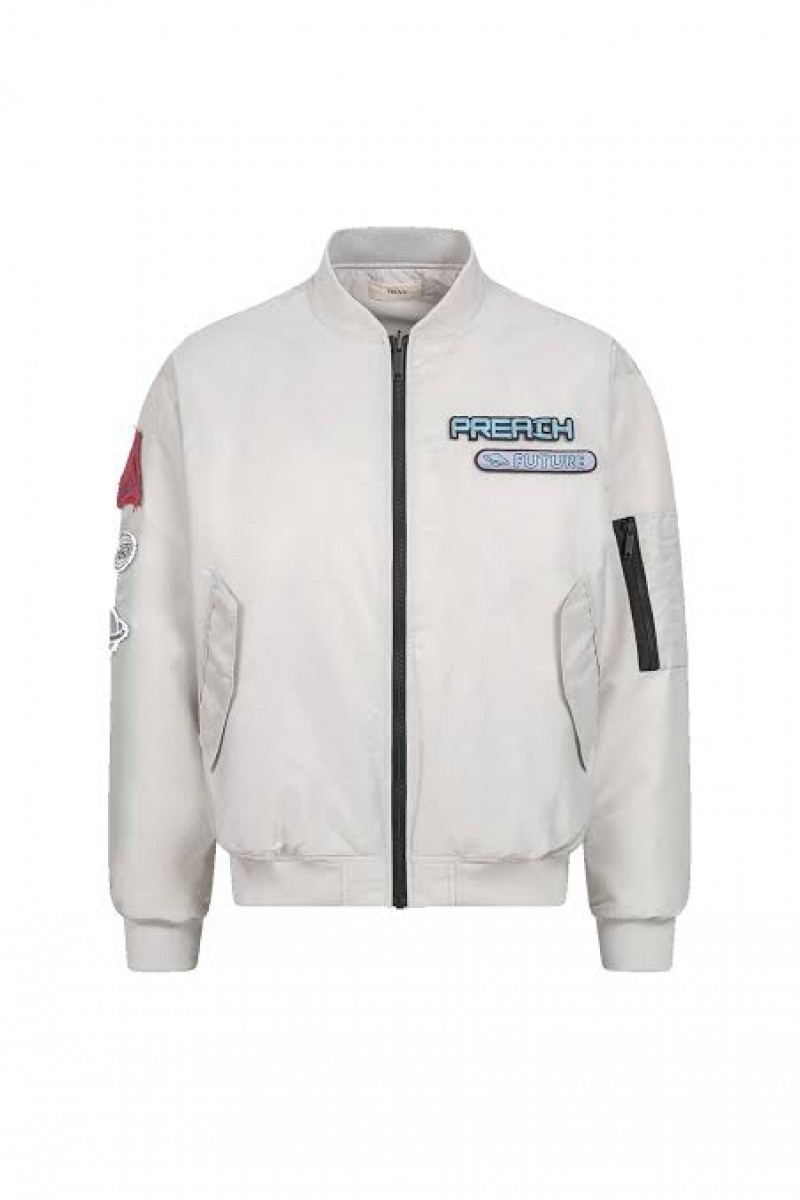 Light gray double-sided Preach bomber jacket with a waterproof coating. The jacket has a double-sided zip, 5 patches on the chest and sleeves, ribbed hems at the waist and at the end of the sleeves, two flap pockets on the hands and one zip pocket on the sleeve. Made from recycled polyester, Preach plants one tree for every product sold.