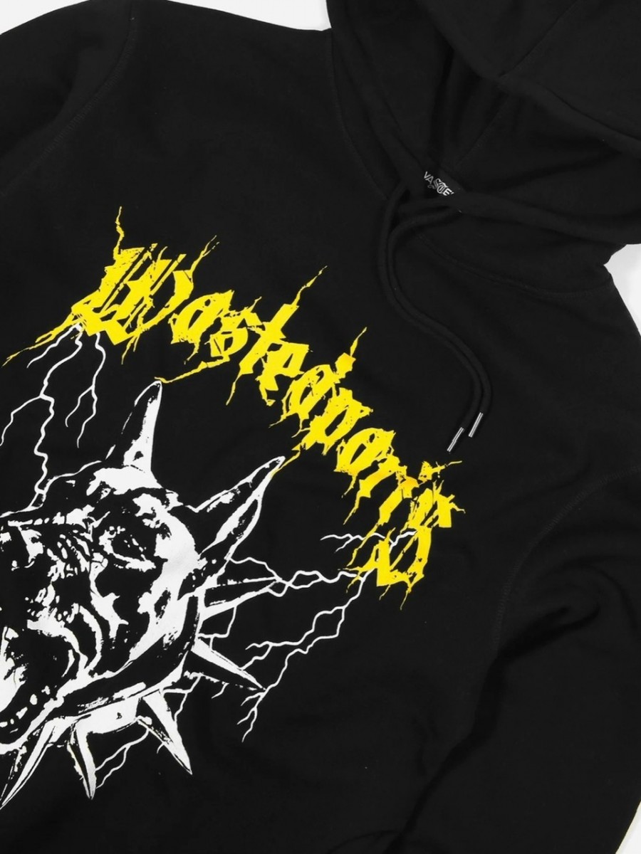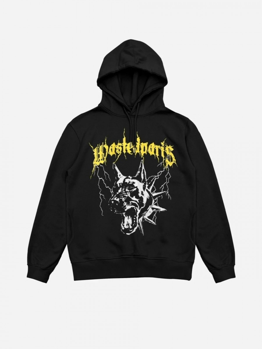 Black Wasted Paris hooded sweatshirt with large chest print. The sweatshirt has two side hand pockets, ribbed cuffs and waist, and a drawstring hood.