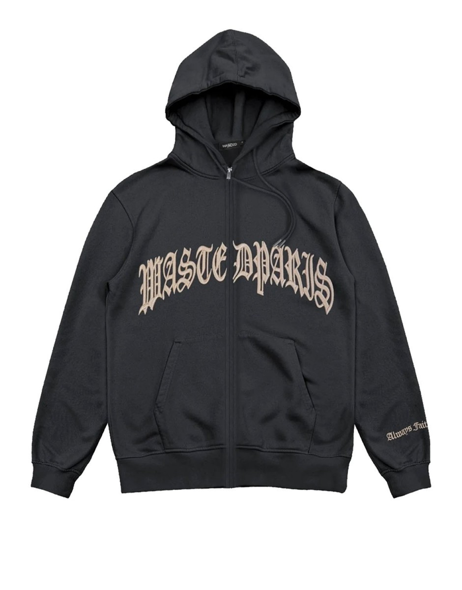 Wasted Paris charcoal sweatshirt with a three-quarter zip and large pink embroidery on the chest. Sweatshirt with two side hand pockets and knits on the sleeves and waist.
