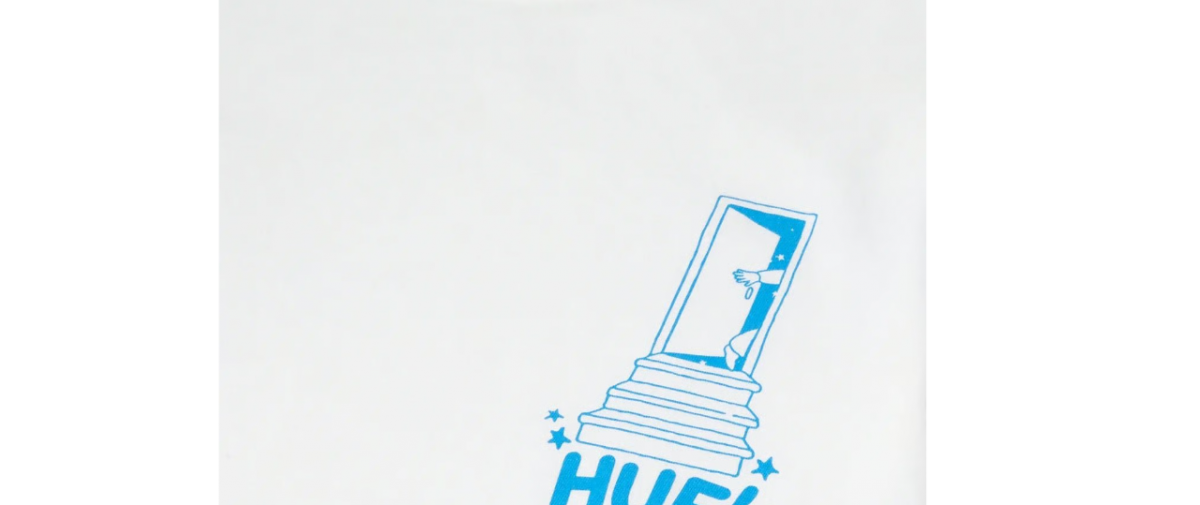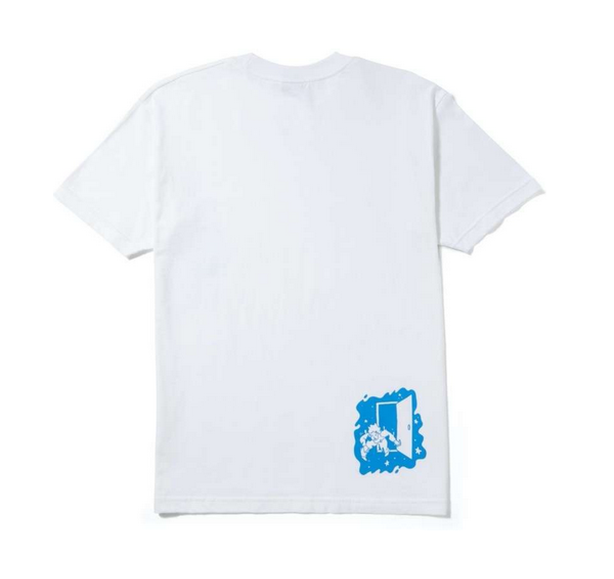 White short-sleeved HUF t-shirt from the Essentials collection. The shirt has a larger print on the chest and a small logo tag on the bottom hem.
