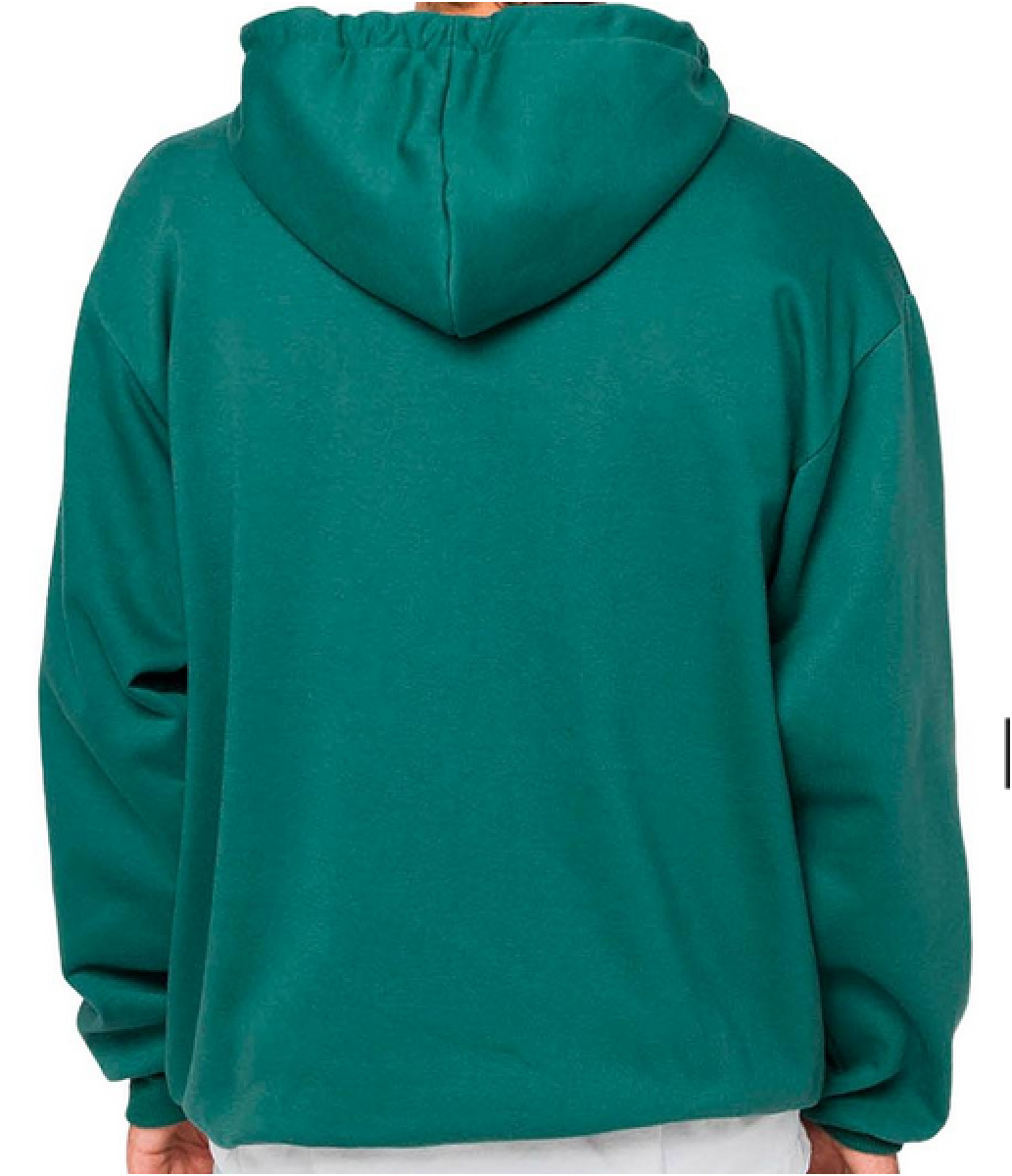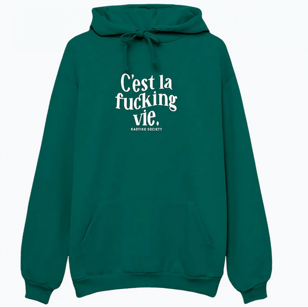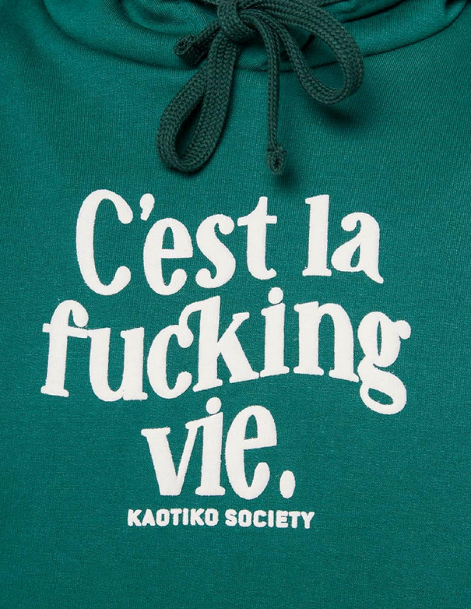 Green Kaotiko hooded sweatshirt with large chest print. The sweatshirt has a classic kangaroo pocket, drawstring hood and ribbed cuffs and waist.