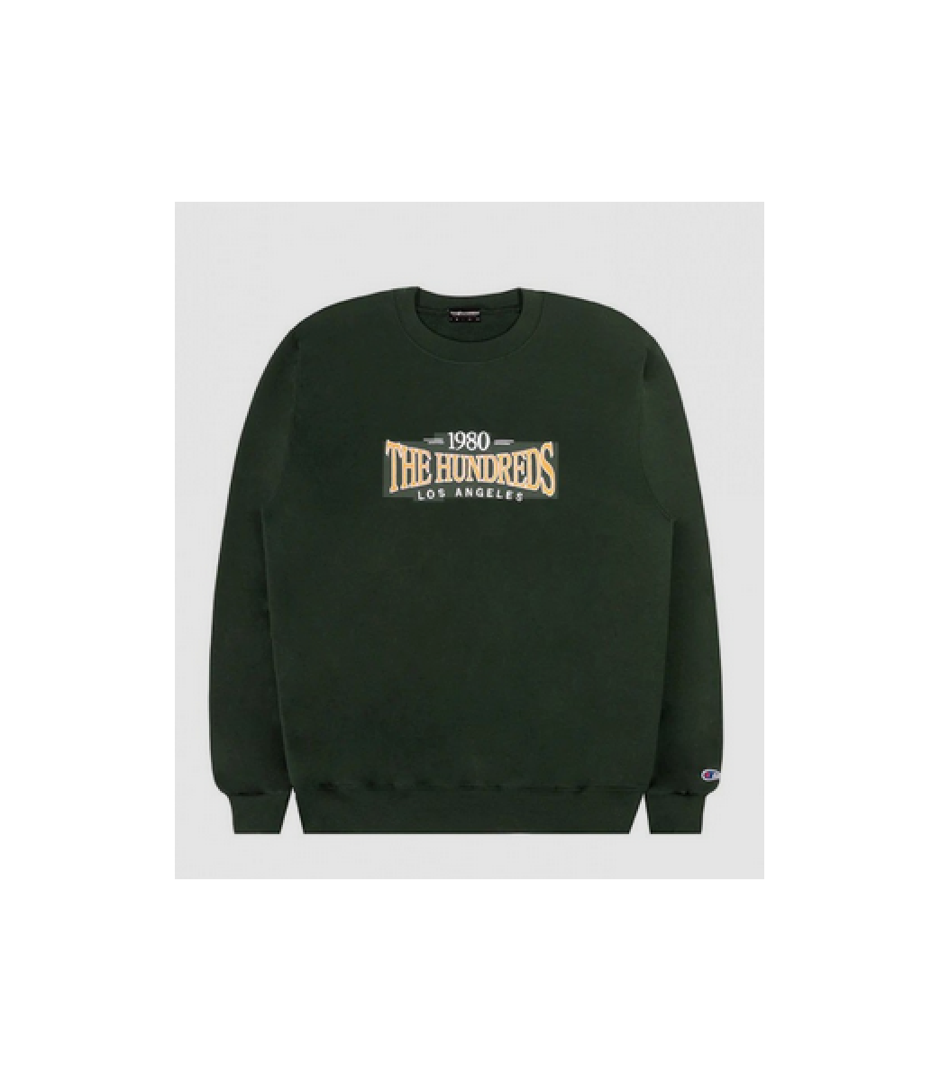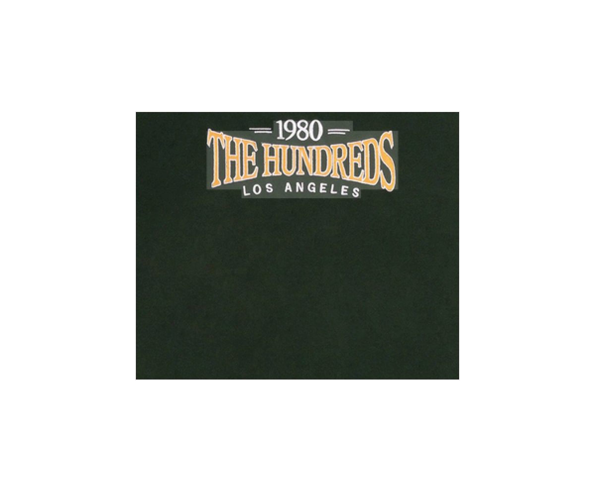 The Hundreds dark green hooded sweatshirt with larger embroidery on the chest. The sweatshirt has ribbed hems on the sleeves and waist.