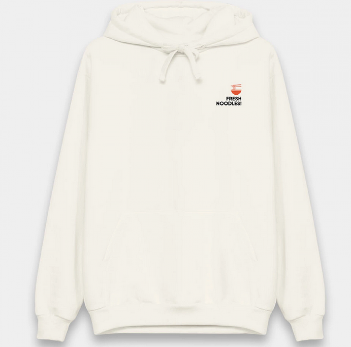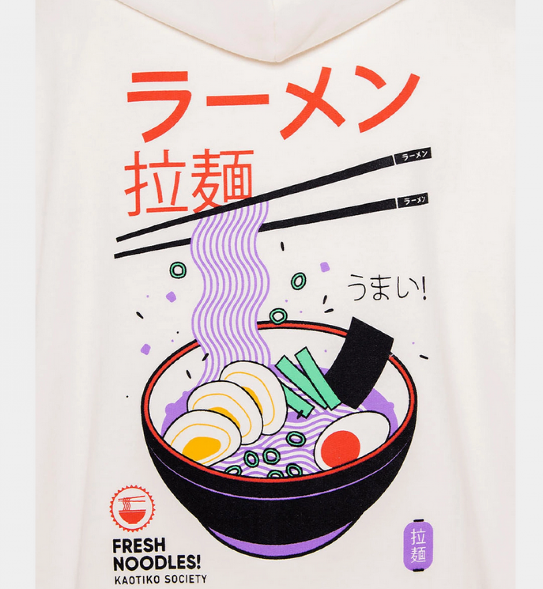 Kaotiko cream hooded sweatshirt with a small print on the left front and a large print on the back. The sweatshirt has a classic kangaroo pocket, drawstring hood and ribbed cuffs and waist.