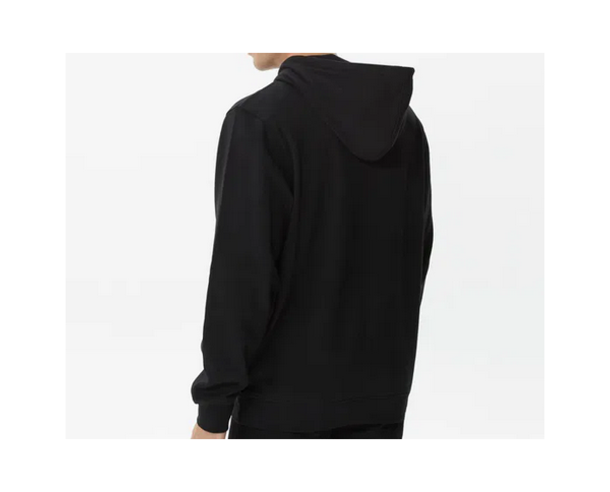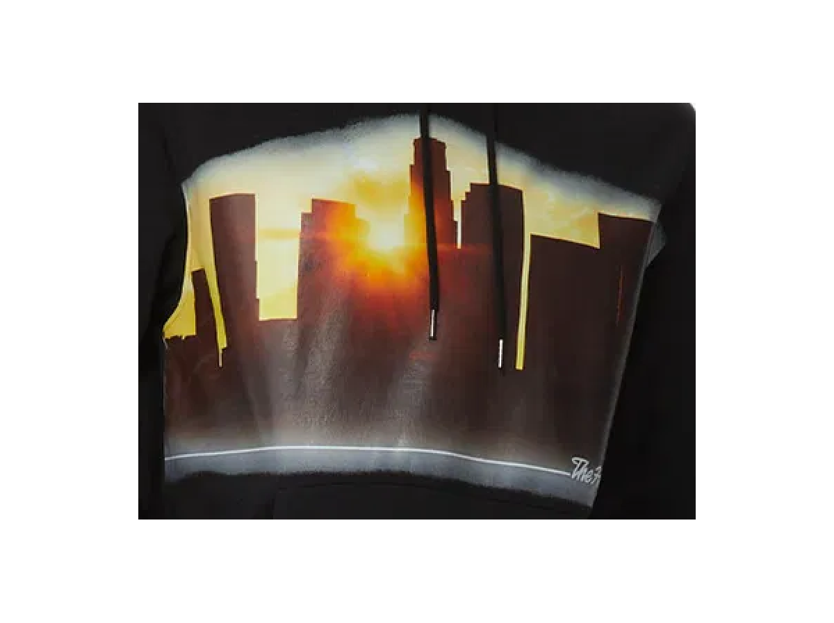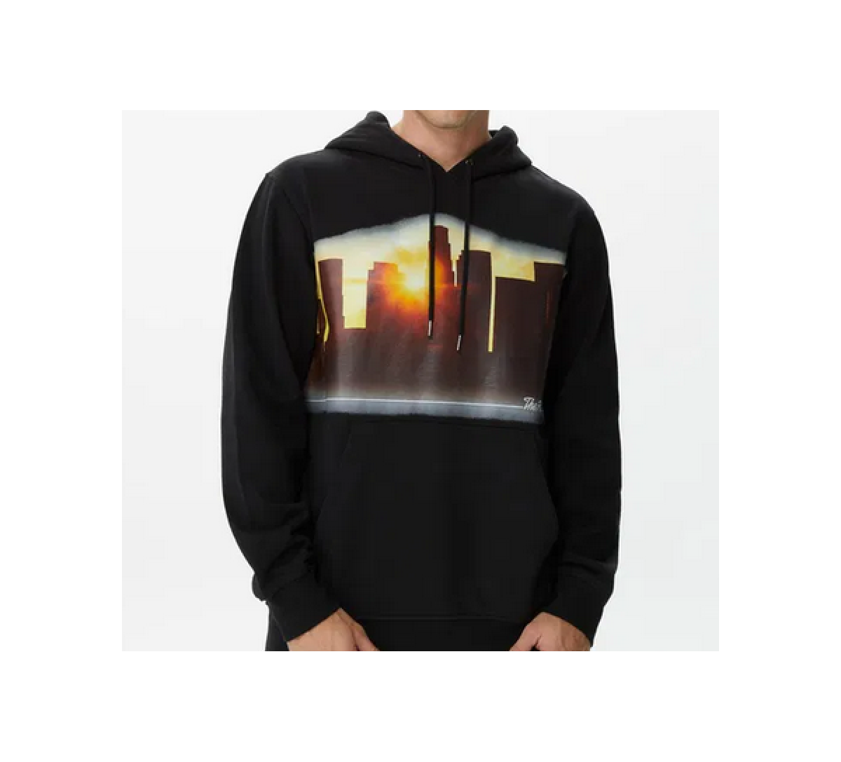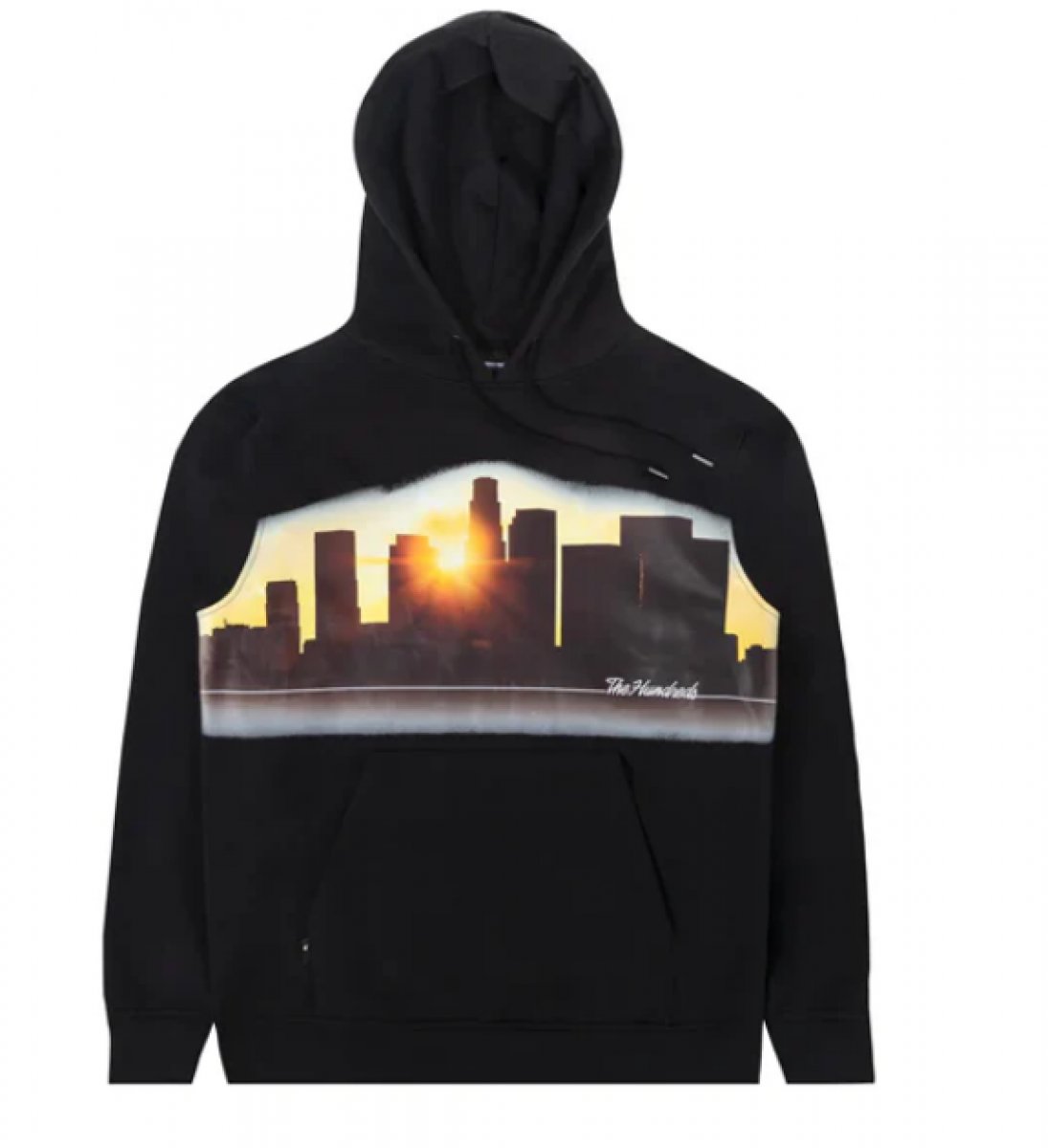 Black hooded sweatshirt by The Hundreds with a large print on the chest. The sweatshirt has a classic kangaroo pocket, drawstring hood and ribbed cuffs and waist.