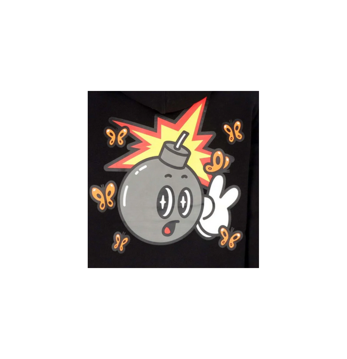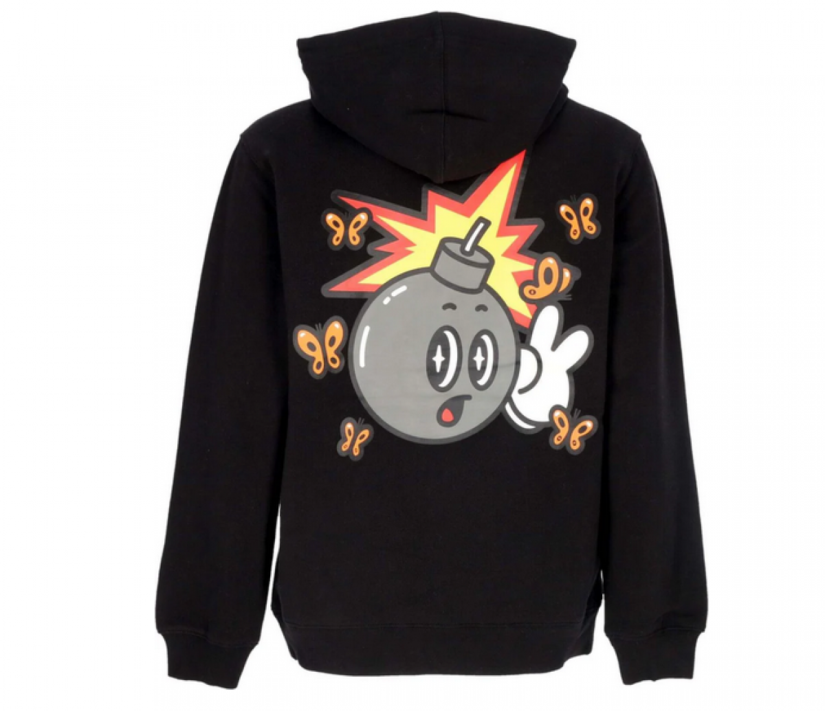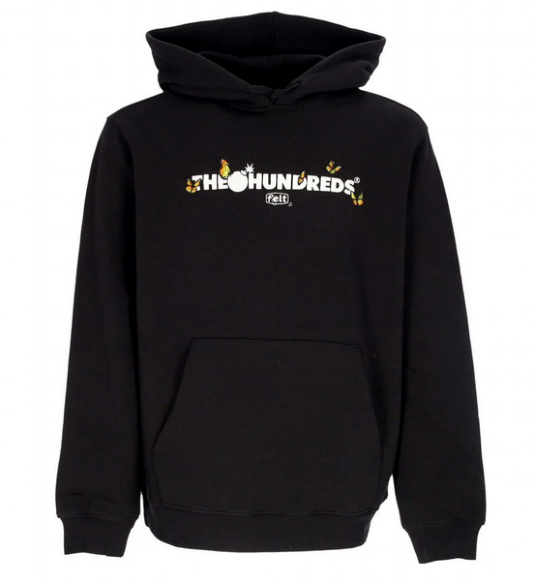 Black hooded sweatshirt by The Hundreds with a small print on the chest and a large print on the back. The sweatshirt has a classic kangaroo pocket, drawstring hood and ribbed cuffs and waist.