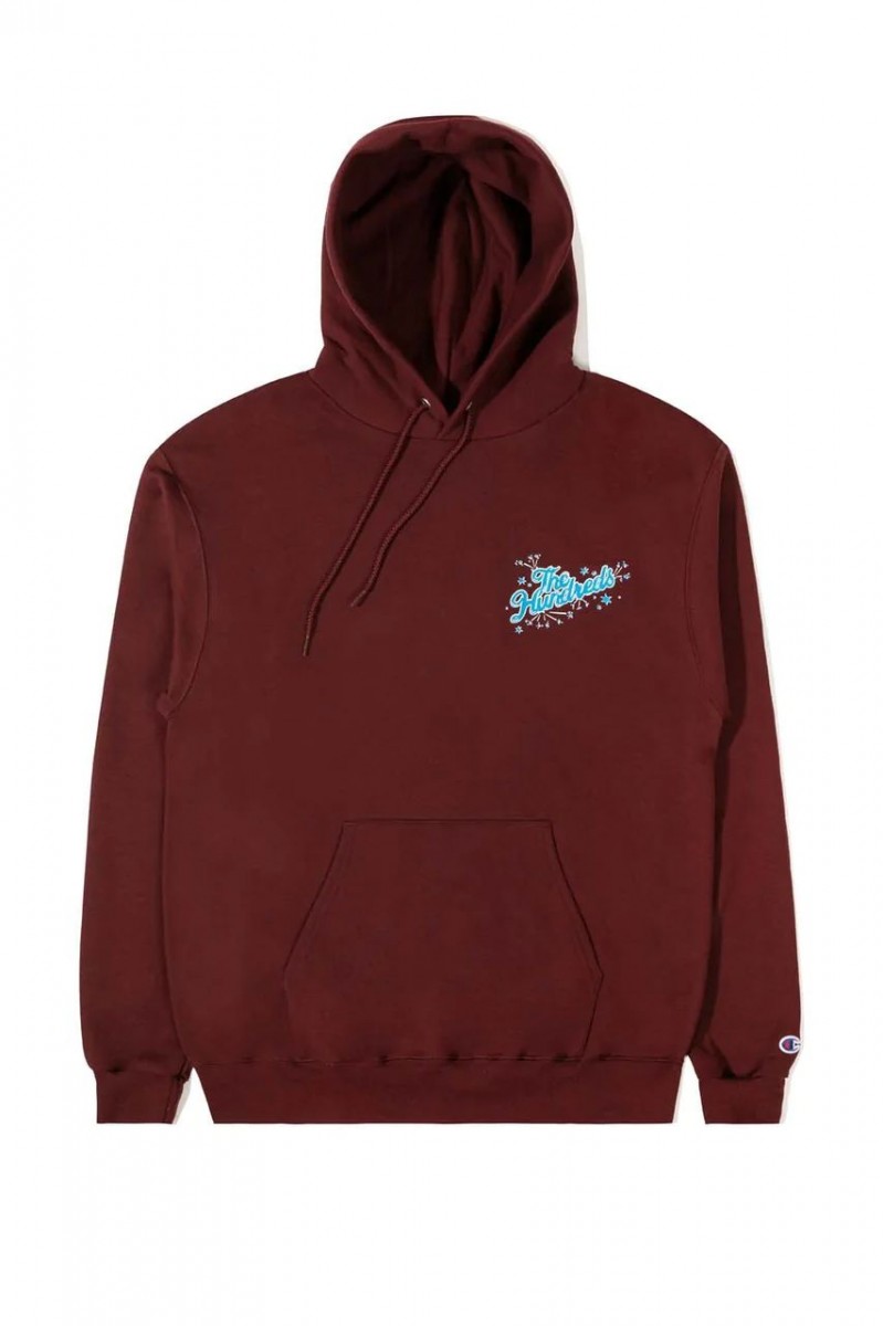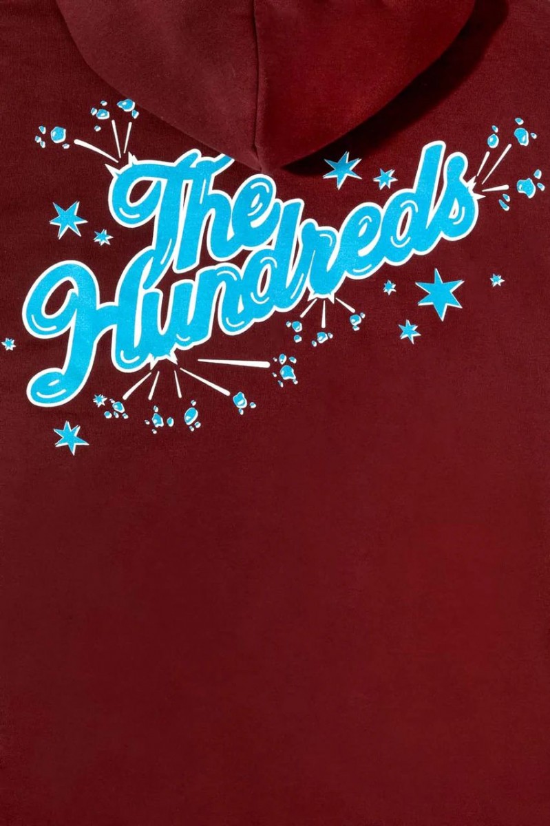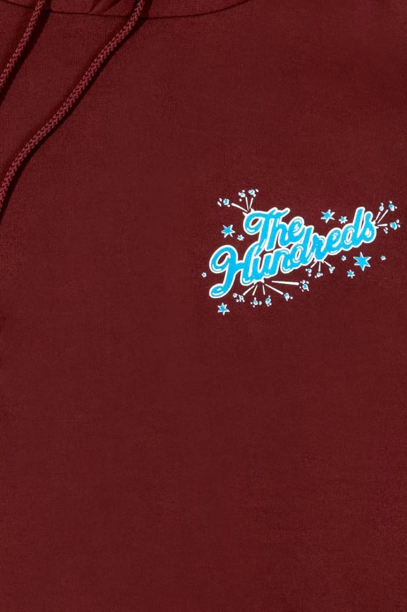 The Hundreds Burgundy Drawstring Hoodie. The sweatshirt has a classic kangaroo pocket and ribbed cuffs and waist. A small print on the front and a large print on the back is complemented by a small Champion logo on the sleeve.