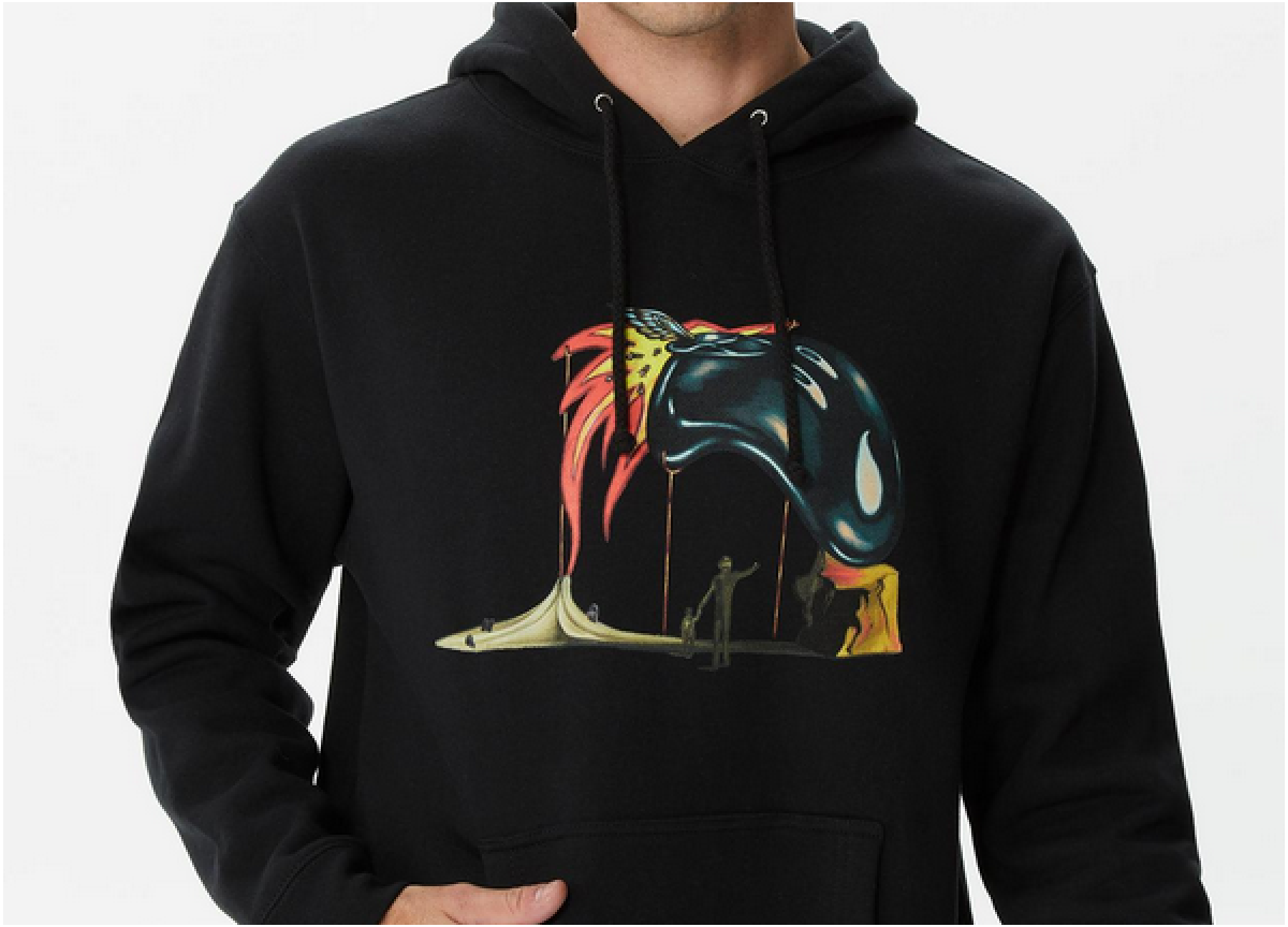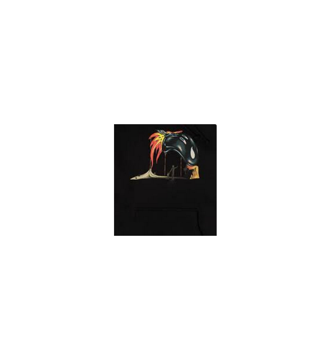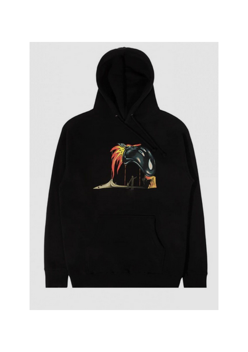Black hooded sweatshirt by The Hundreds with a large print on the chest and a small logo behind the neck. The sweatshirt has a classic kangaroo pocket, drawstring hood and ribbed cuffs and waist.