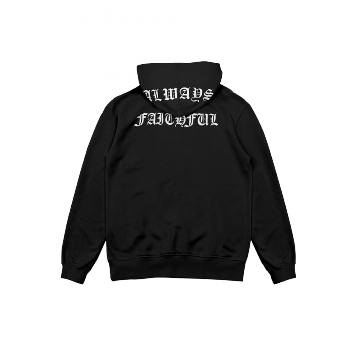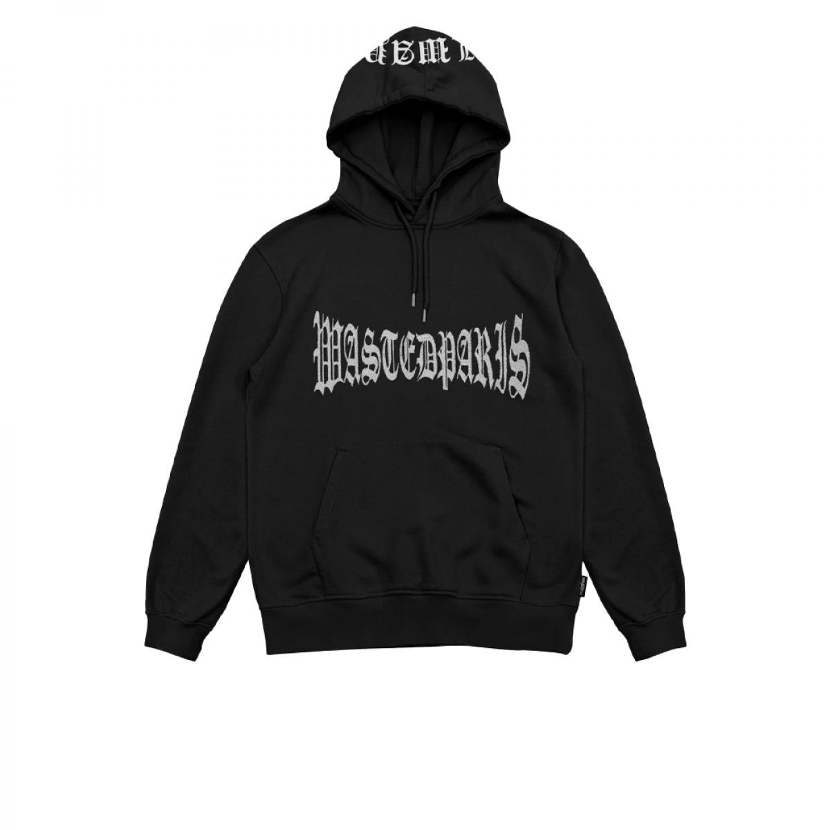 Black Wasted Paris hooded sweatshirt with large chest print. The sweatshirt has two side hand pockets, ribbed cuffs and waist, and a drawstring hood.