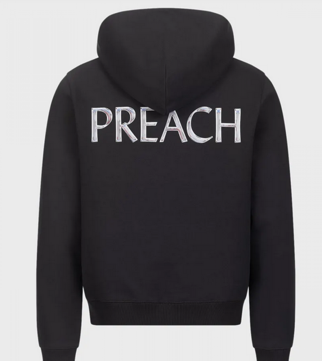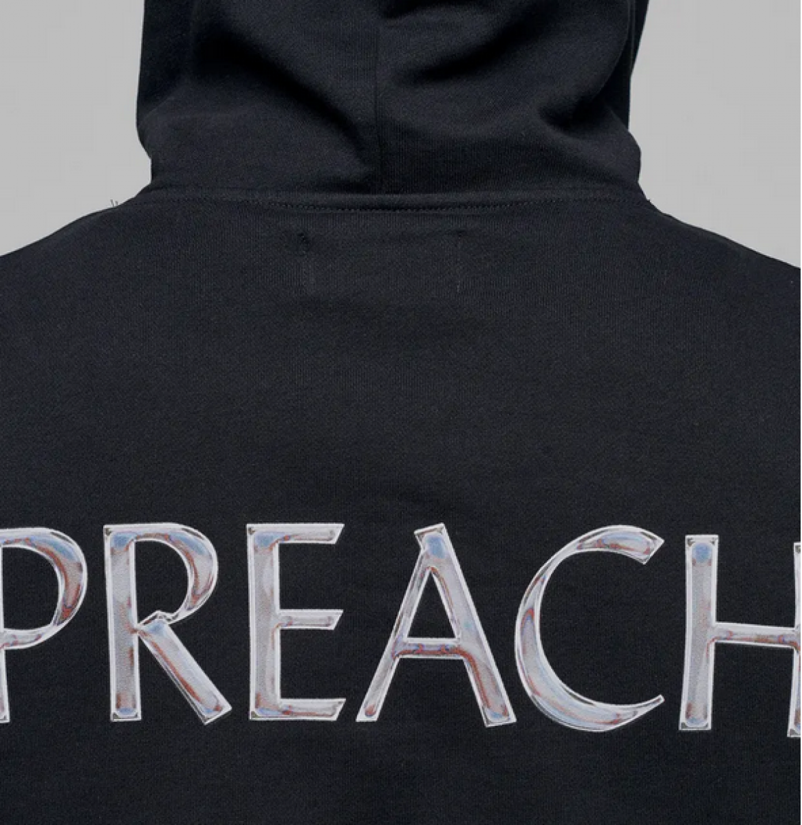 Black Preach hoodie with a large chrome print on the back. The sweatshirt has a classic kangaroo pocket, ribbed hems on the sleeves and a regular fit. Made from certified organic cotton, Preach plants one tree for every product sold.