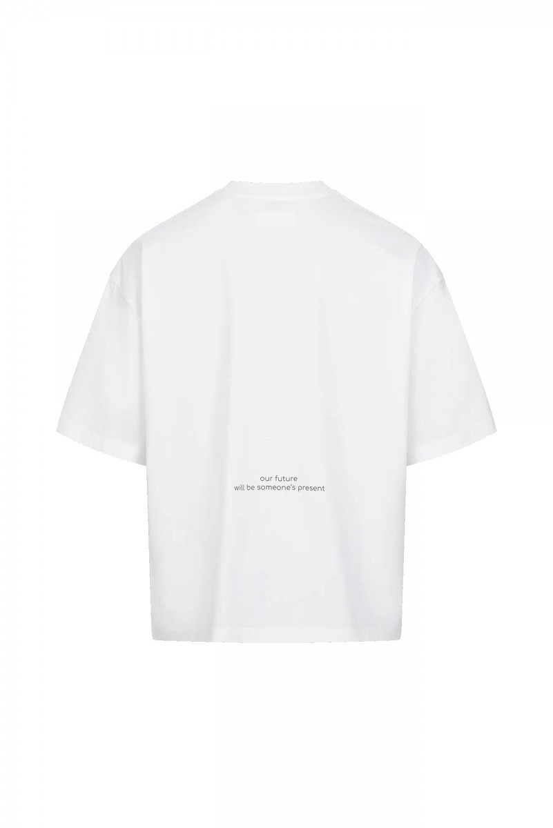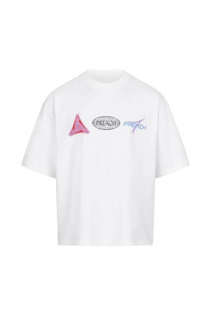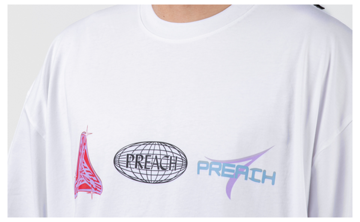 White Preach t-shirt with a large print on the chest and a small print on the back. The T-shirt has an oversize cut, extended sleeves and a tighter hem around the neck. It's made from certified organic cotton, and Preach plants a tree for every piece sold.