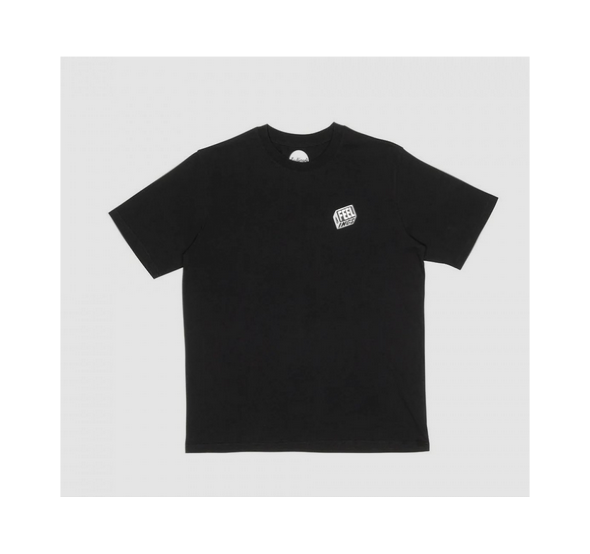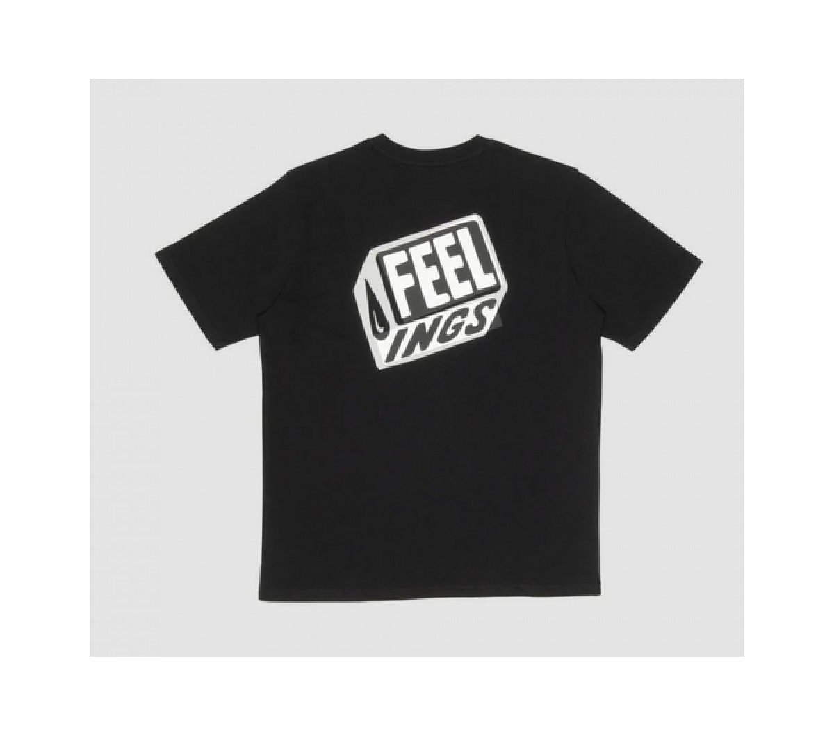And Feelings black t-shirt with short sleeves, a small print on the left front and a large print on the back.