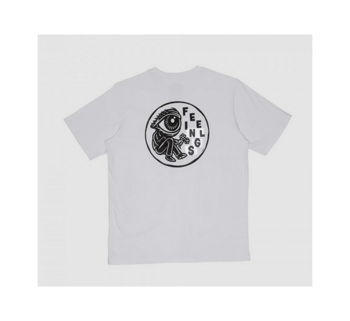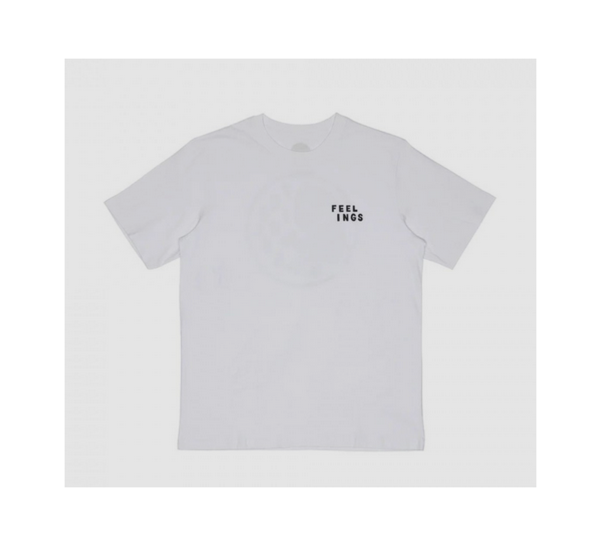 And Feelings white t-shirt with short sleeves, a small print on the left front and a large print on the back.