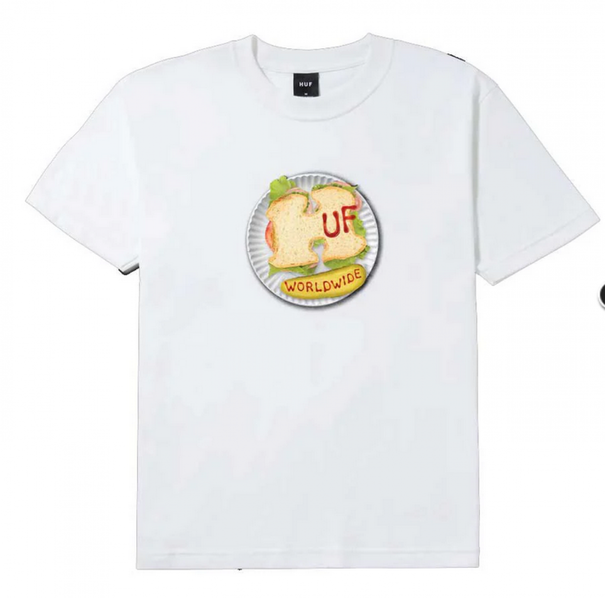 White short-sleeved HUF t-shirt from the Essentials collection. The shirt has a larger print on the chest and a small logo tag on the bottom hem.