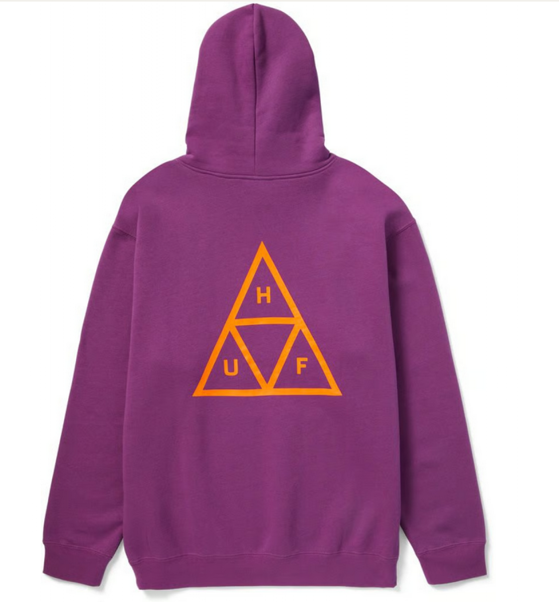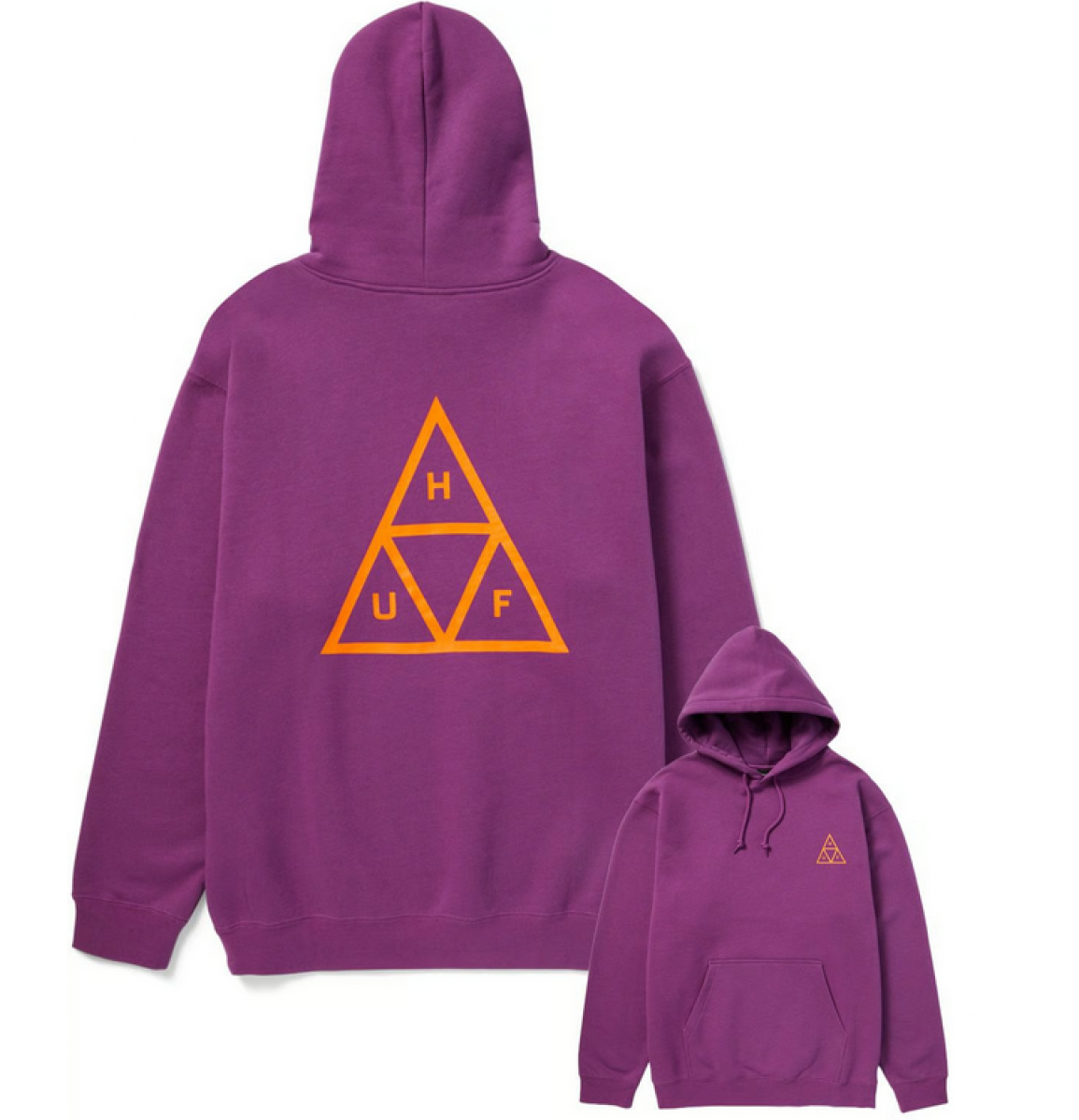 HUF grape hoodie from the Essentials collection. The sweatshirt has a chest print, a small logo tag on the side, a classic kangaroo pocket and drawstring hood.