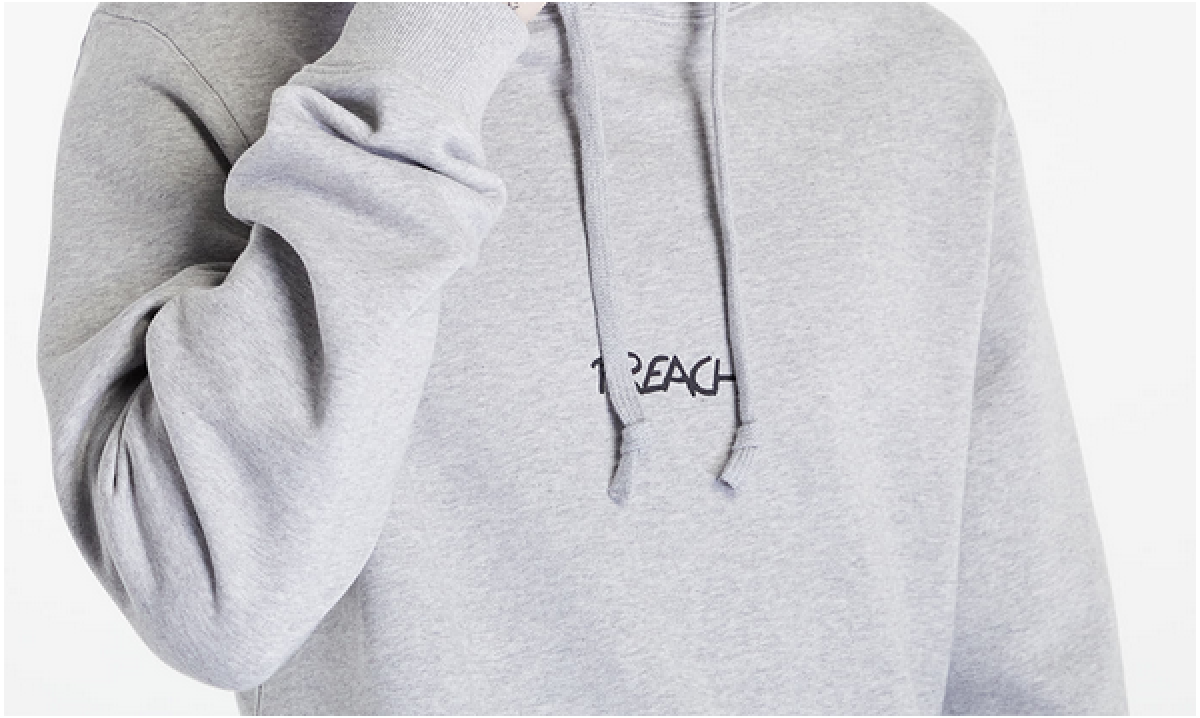 Gray Preach hoodie with a small logo on the chest and a large print on the back. The sweatshirt has drawcords on the hood, a classic kangaroo pocket and hems on the sleeves and waist. It is made in Portugal from certified organic cotton.