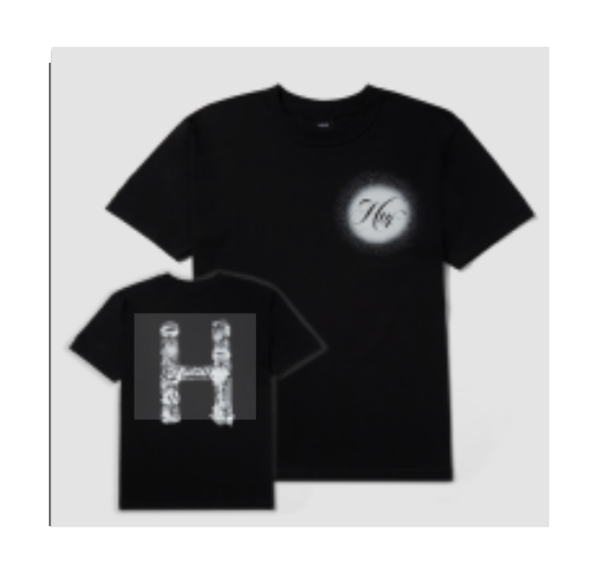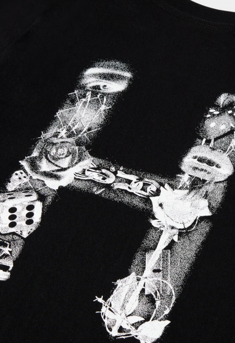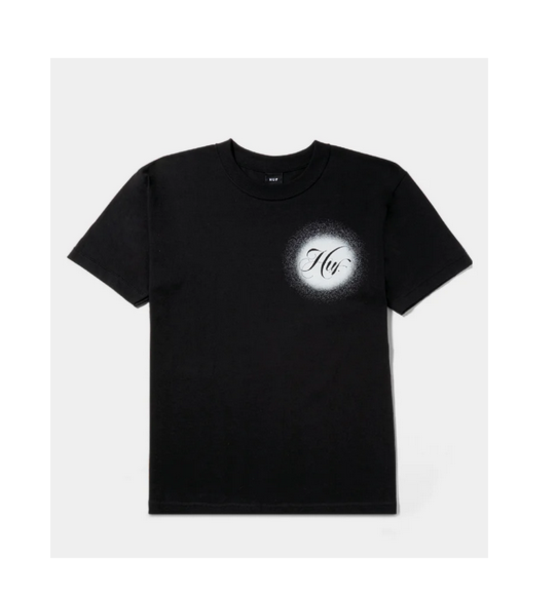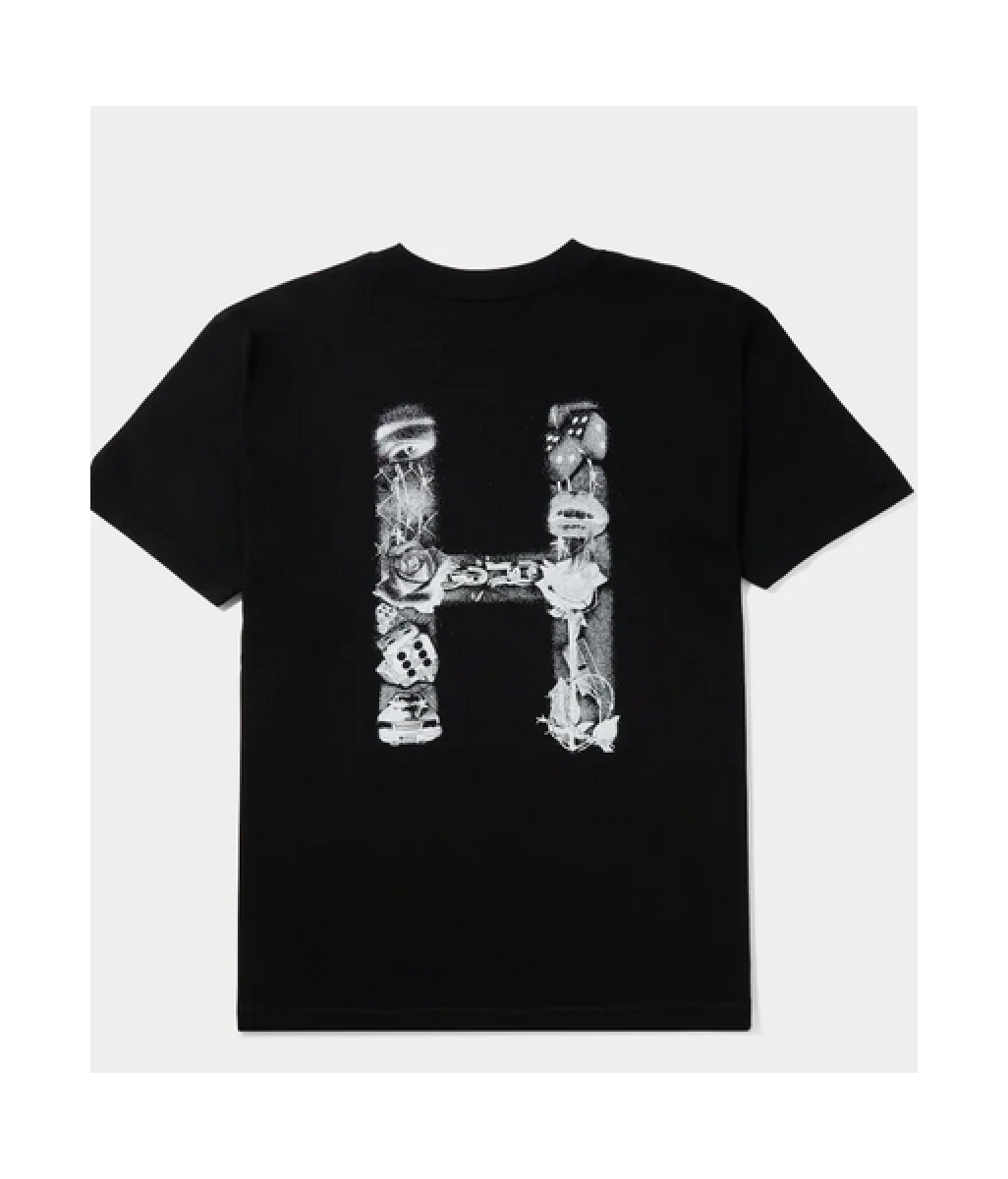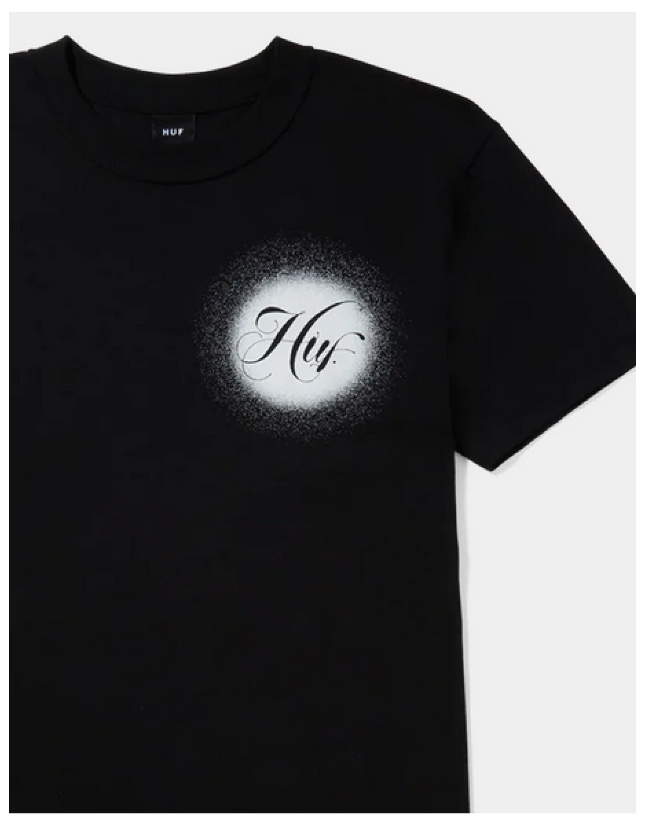 Black short-sleeved HUF t-shirt.