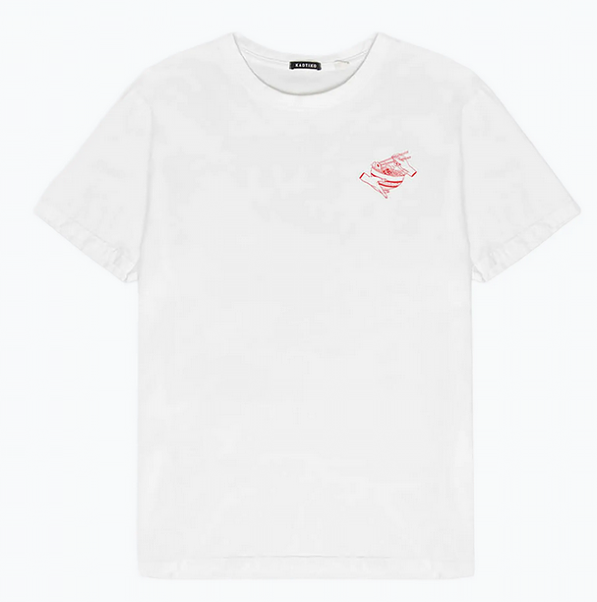 White Kaotiko t-shirt with short sleeves, small print on the chest and large print on the back.