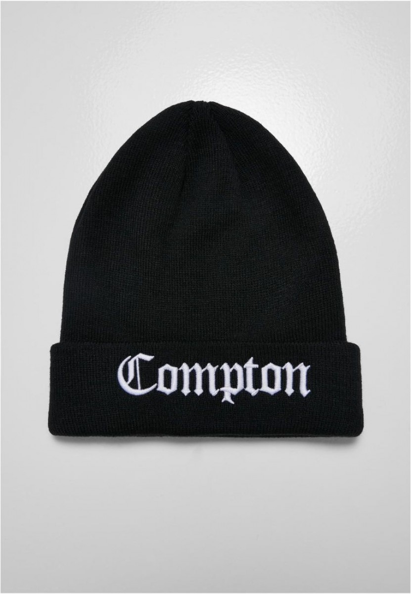 Jednobarevný černý kulich Urban Classics s výšivkou „Compton“. Použitý vzor těžkého žebrového úpletu umně dotváří atmosféru čepice. Tkanina je hřejivý a jemný akryl, který přilne k hlavě jako praktická univerzální velikost.