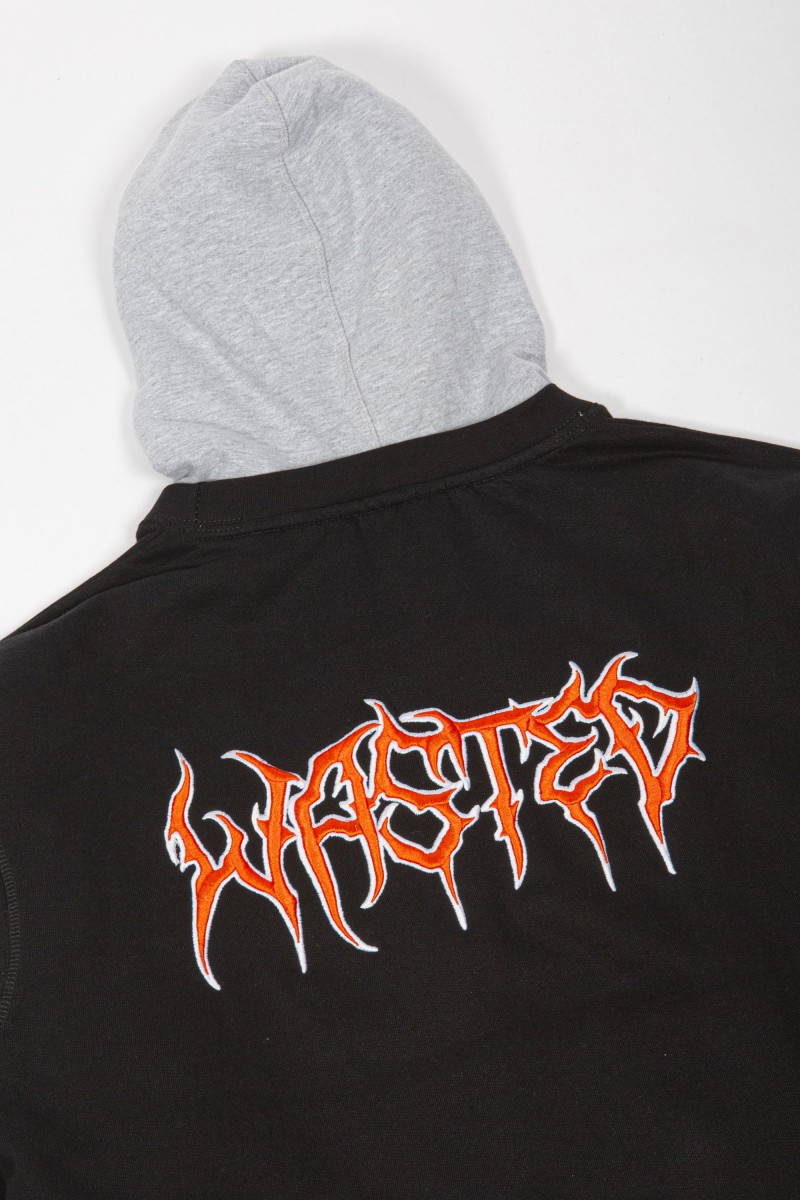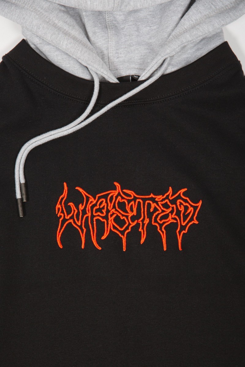 černá mikina Wasted Paris se šedivou kapucí a velkým červeným potiskem na hrudi a zádech.