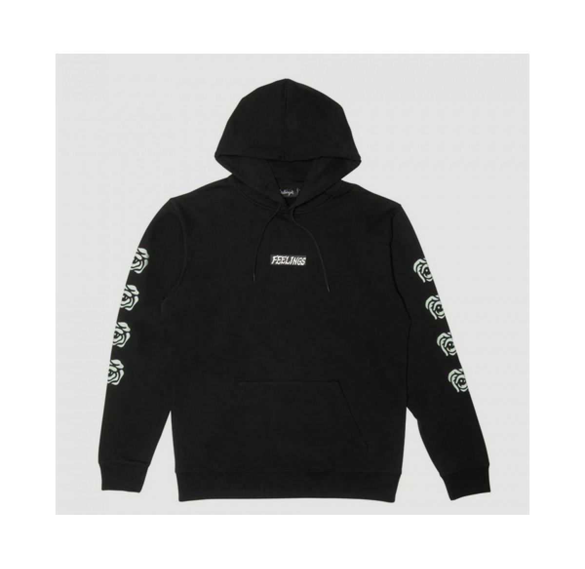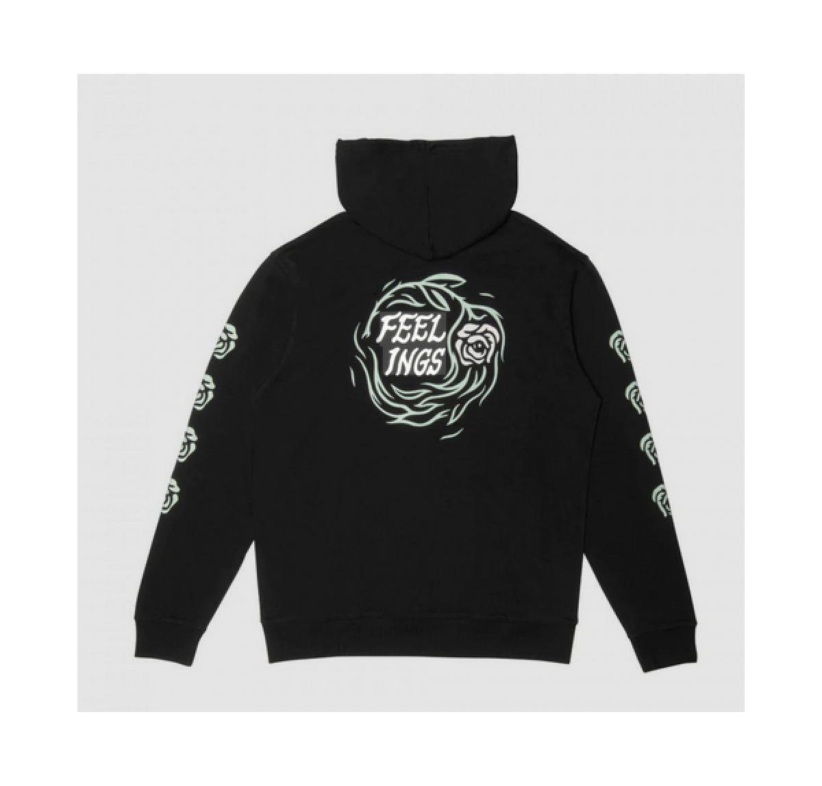 Černá mikina And Feelings s kapucí, malým potiskem na levé přední straně a velkým na zádech. Mikina má klasickou klokaní kapsu, stahovací šňůrky u kapuce a žebrované lemy na rukávech a v pase.