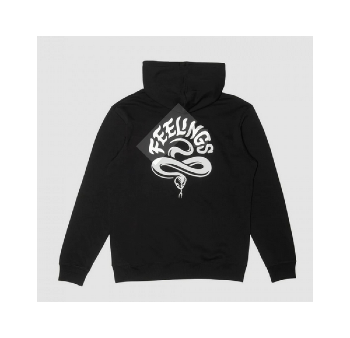 Černá mikina And Feelings s kapucí, malým potiskem na levé přední straně a velkým na zádech. Mikina má klasickou klokaní kapsu, stahovací šňůrky u kapuce a žebrované lemy na rukávech a v pase.
