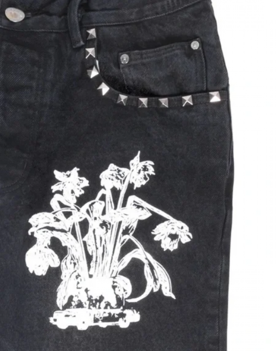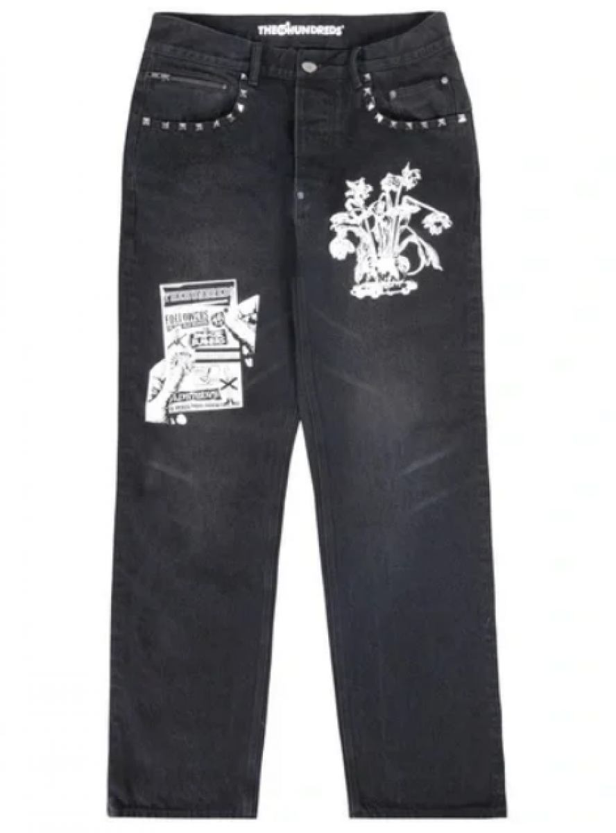 Černé jeans The Hundreds s potiskem na nohavicích a zadní kapse. Rifle mají relaxed fit, pyramidové cvočky na předních kapsách a jedna přední kapsa je na zip.
