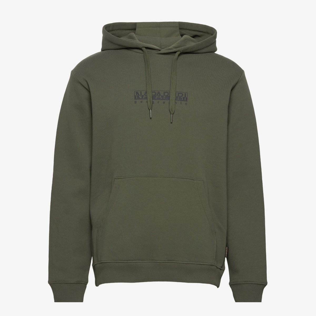 Šedá mikina Napapijri s kapucí, která má stahovací šňůrky a širší střih. Mikina má potisk na hrudi a klokaní kapsu.