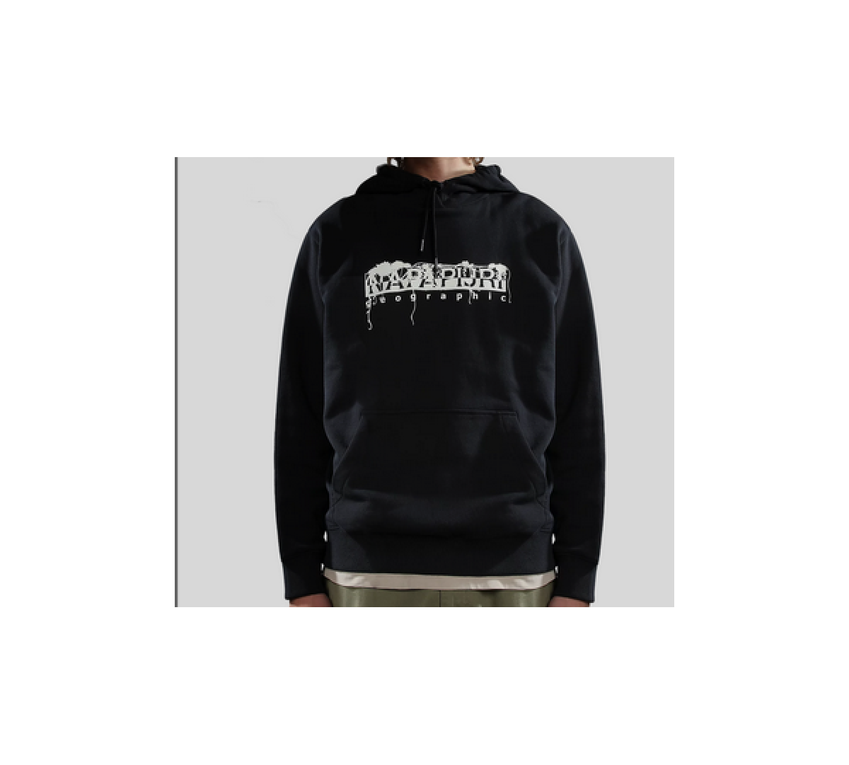 Černá mikina Napapijri s kapucí a s velkým potiskem na hrudi. Mikina má klasickou klokaní kapsu, stahovací šňůrky u kapuce a žebrované lemy na rukávech a v pase.
