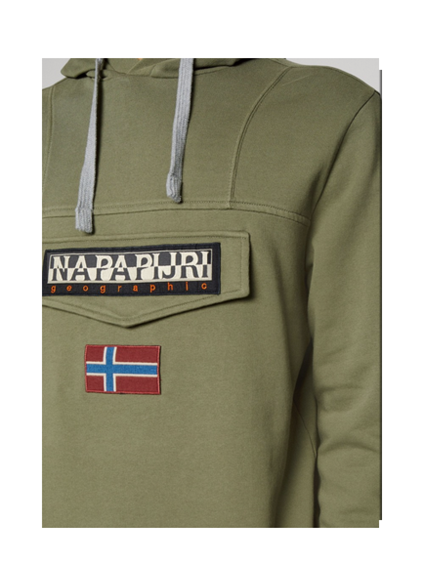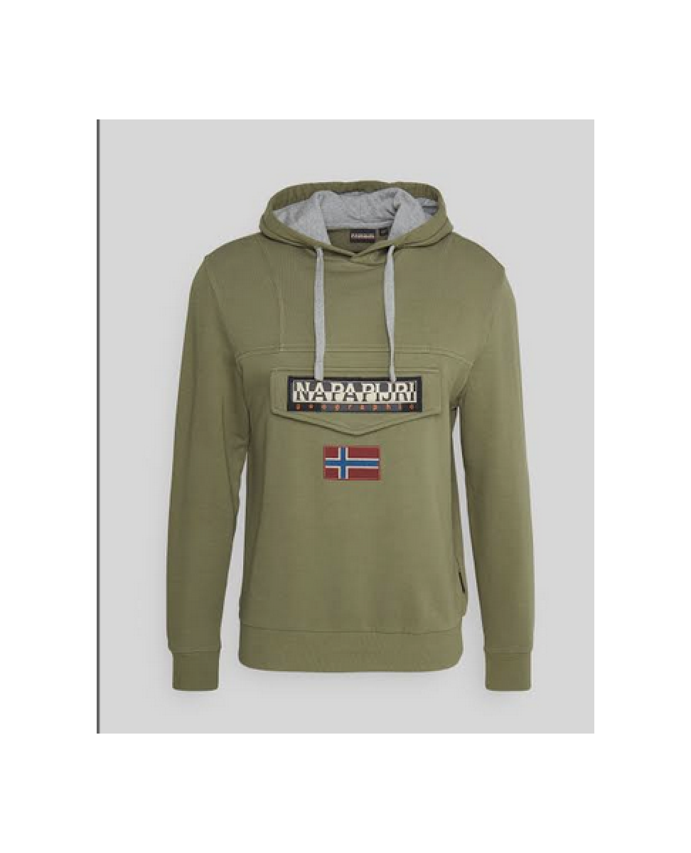 Olivová mikina Napapijri s kapucí a našivkami na hrudi. Mikina má pod přední klopou kapsu na zip, stahovací šňůrku u kapuce a žebrované lemy na rukávech a v pase.