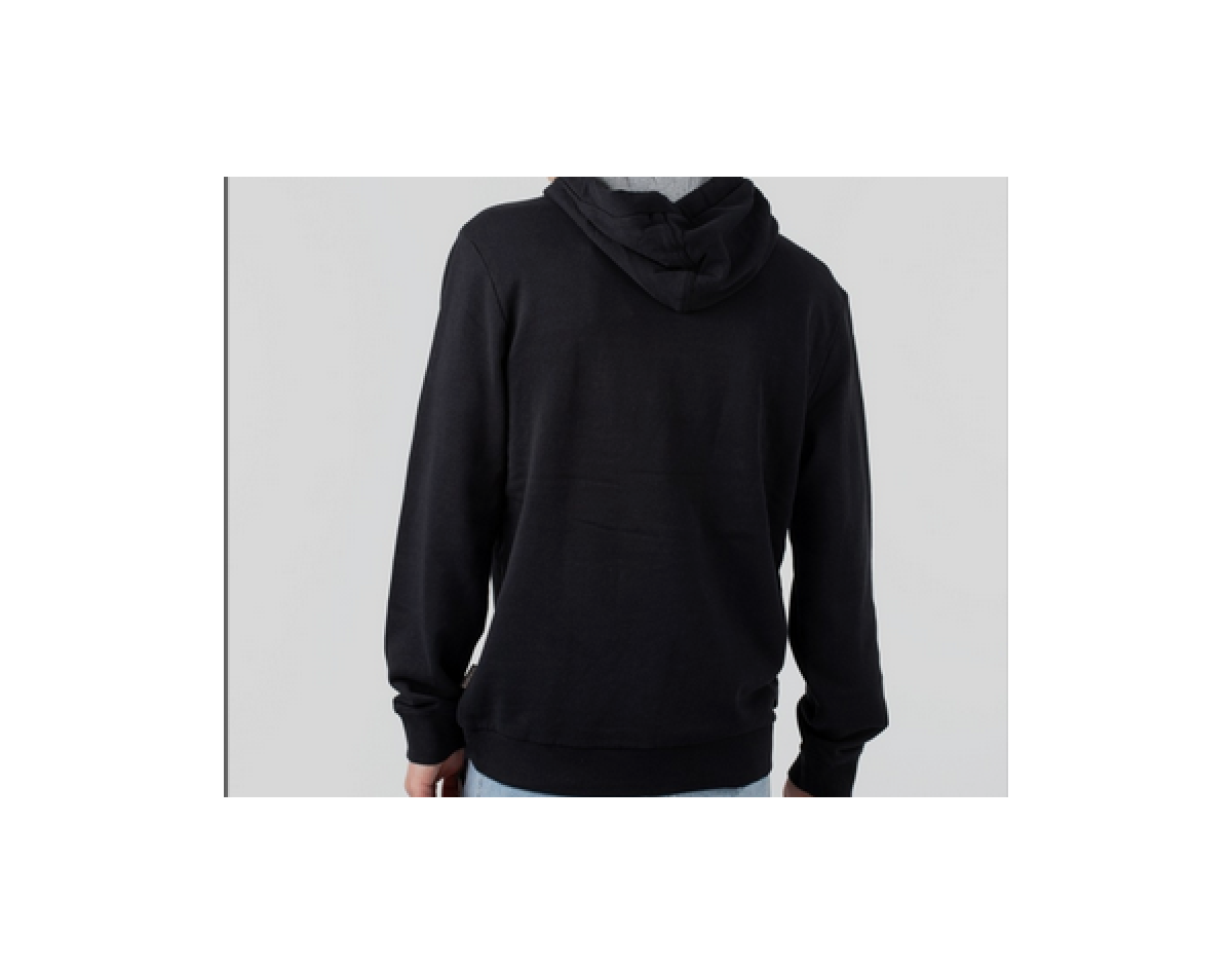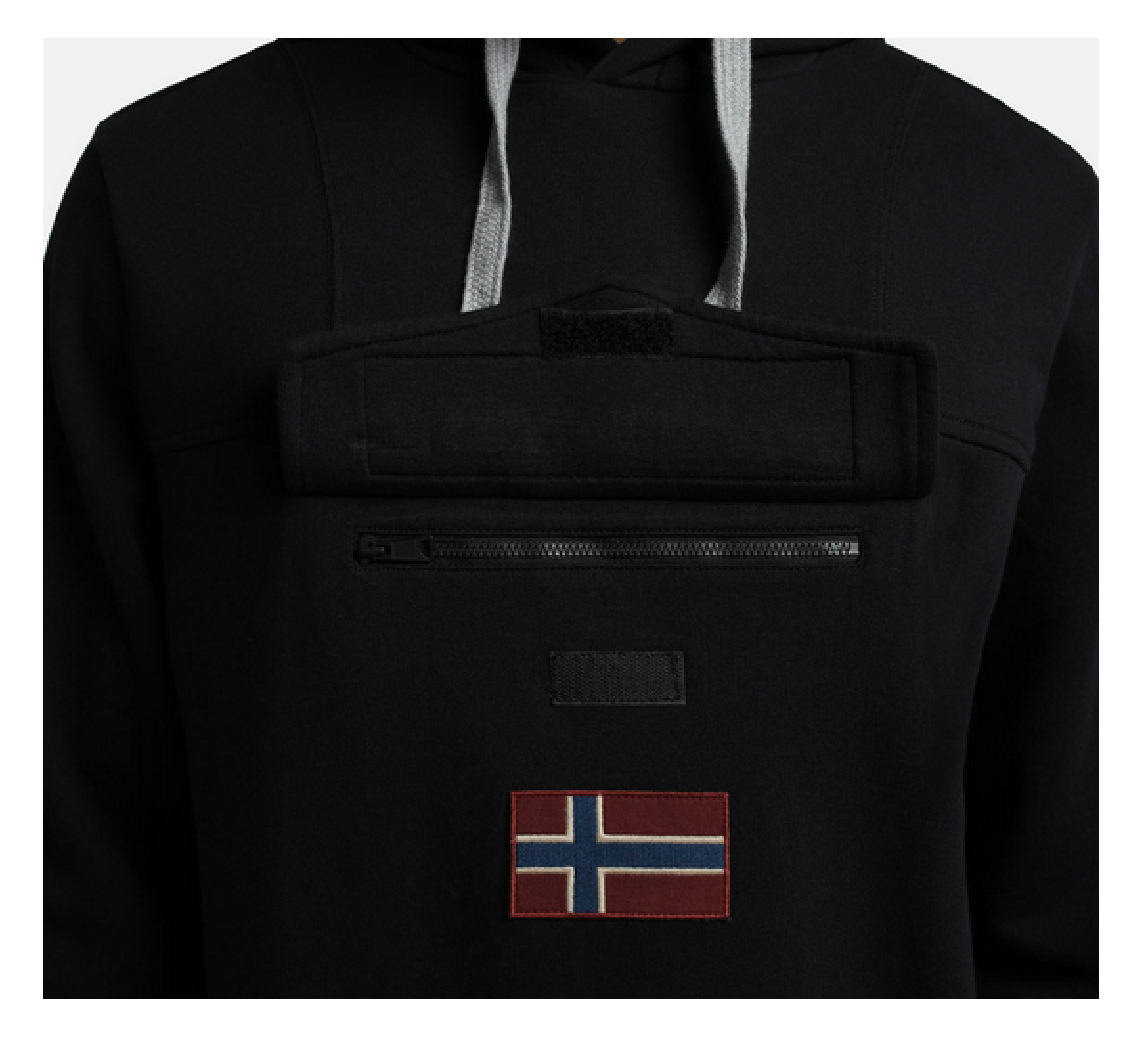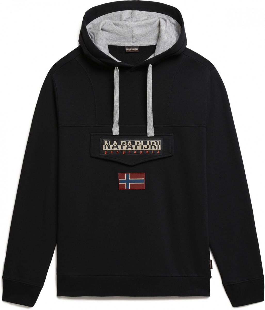 Černá mikina Napapijri s kapucí a našivkami na hrudi. Mikina má pod přední klopou kapsu na zip, stahovací šňůrku u kapuce a žebrované lemy na rukávech a v pase.