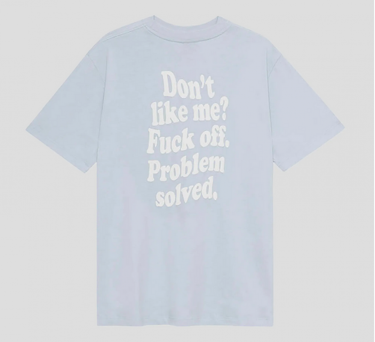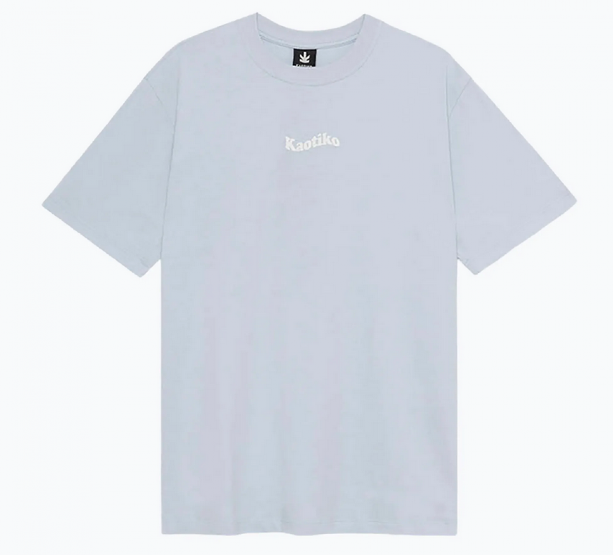 Světle modré tričko Kaotiko s krátkým rukávem, malým potiskem na levé přední straně a velkým na zádech.